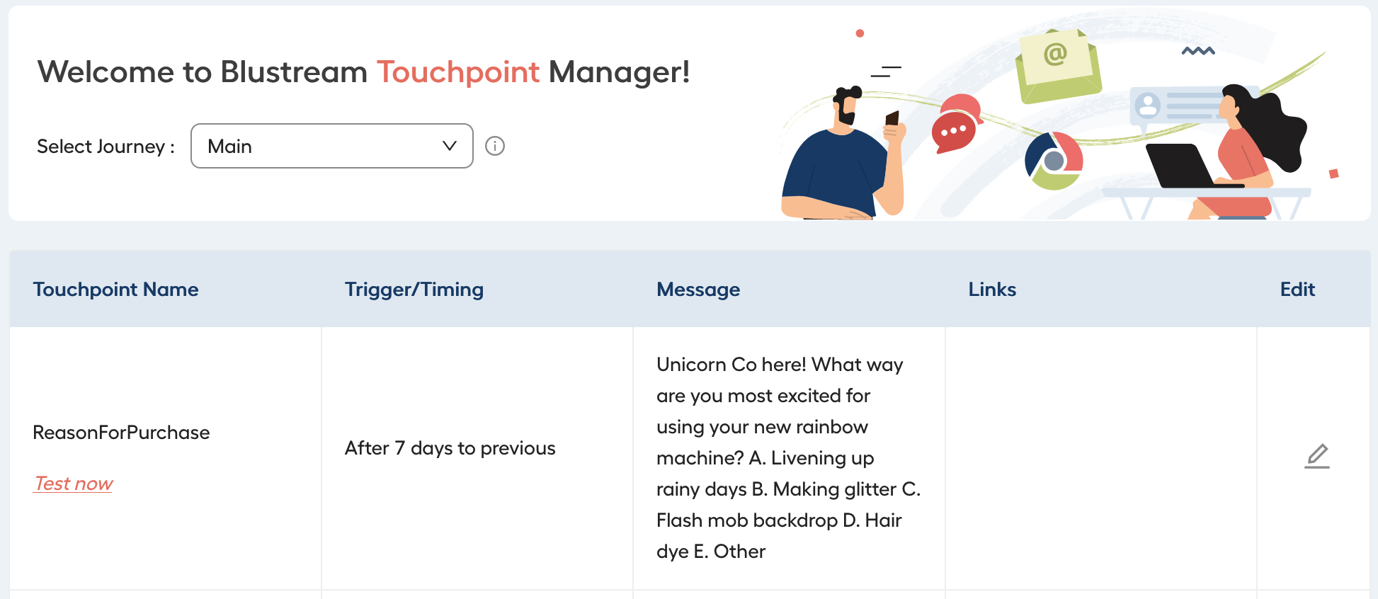 To use this feature, load up the Touchpoint Manager. Below each touchpoint’s name is a new button called “Test now.” Click on it. From the list of contacts, check the box next to your own name and click “Send.”
