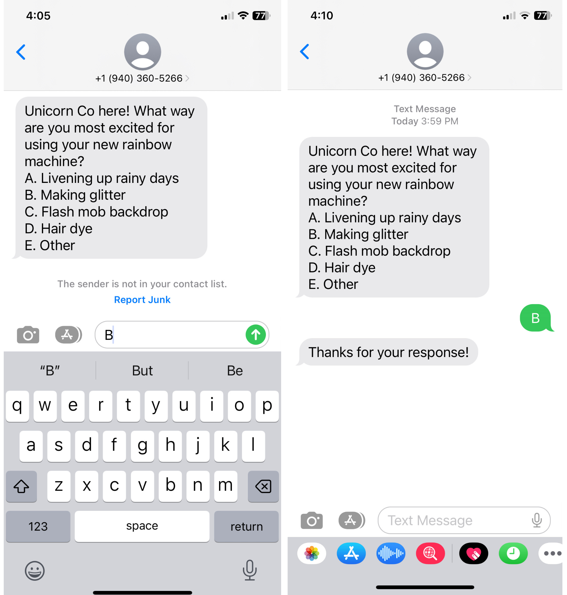 After a few seconds, your phone should buzz with a new text! Respond to this message to test quick replies. If there’s something you don’t like, head back to the Touchpoint Manager to change any message and send it again. Sometimes iOS and Android can format texts differently, so grab a friend’s phone to double check that the SMS is formatted the way you want.
